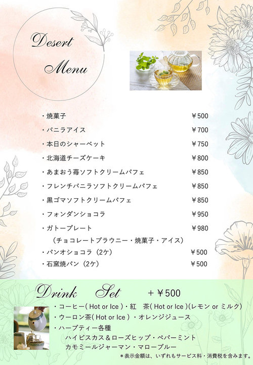 - ドリンク(コーヒー or 紅茶 or ウーロン茶 or オレンジジュース)